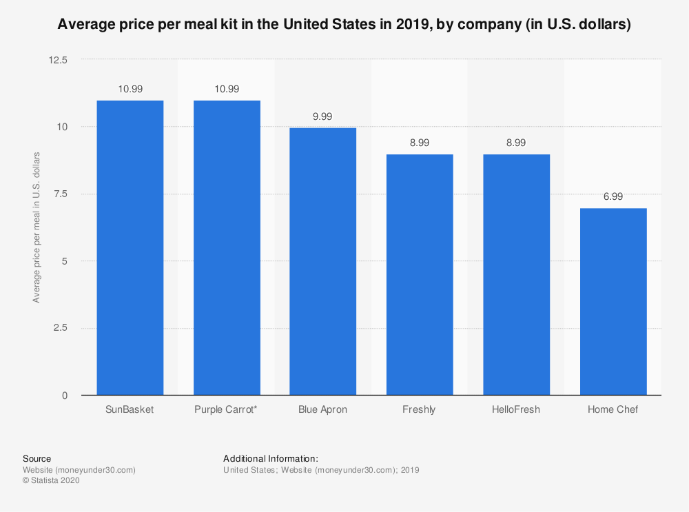 This graphic displayed that most meal kits cost around $10 per meal in the U.S., not much cheaper than shop in the supermarket or order prepared meals. Source: Statista.