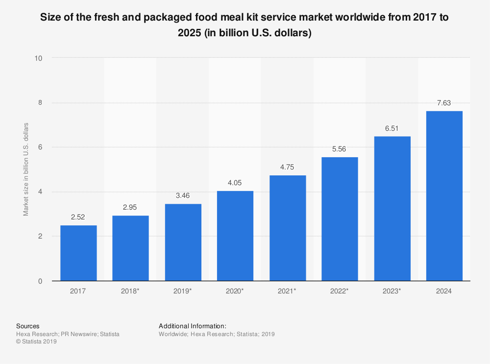 A report from statista showed that the meal kit market has reached $2.52 billion in 2017. In America, 17 per cent of consumers have tried the meal kit at least once. It was predicted that until 2024, the market size will grow to $7.63 billion.